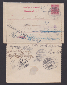 Kartenbrief-Ganzsache 10 Pfg. 1901 als Retourbrief, innen seltener privater Postkarten-ähnlicher Zudruck "Gruss aus Neustrelitz, Glückscollecte D. Lenin"