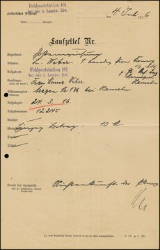 1916, seltener Feldpost-Laufzettel über eine Postanweisung von der Feldpoststation 101, 5. Landwehr-Div., nach Aerzen