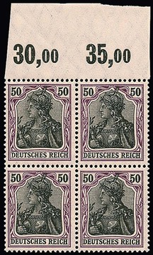 50 Pfg. auf orangeweiß im postfrischen Oberrand-Viererblock, sign. Jäschke. Mi. 410,- +