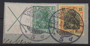 5 Pfg. Germania, Andreaskreuz-Zusammendruck, nebst 25 Pfg., auf Briefstück, Mi. 250,-