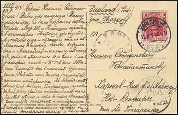 10 Pfg. dunkelrosarot, Friedensdruck, ein verkürzter Zahn, als sehr seltene Einzelfrankatur auf Auslands-Postkarte von Karlsruhe 1914 nach Rußland. Michel "-.-" (für die häufigere Mischfrankatur schon 6000,-). Attest Jäschke-L., Foto siehe Katalog-Rückseite