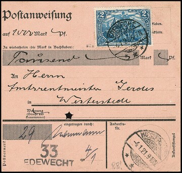 2 Mk. als sehr seltene Einzelfrankatur auf Postanweisung (!) aus Edewecht 1921, sign. Jäschke