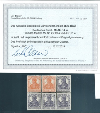 7 1/2 und 15 Pfg. Germania, Heftchenblatt 14aa tadellos ungebraucht ohne Rand, Fotoexp. Fleiner. Mi. (1200,-)