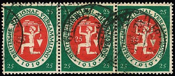 25 Pfg. Nationalversammlung im gest. Dreierstreifen, rechte Marke Plattenfehler "1019", Attest Bechtold. Mi. 400,- +
