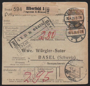 1,50 Mk. per acht als MeF, vs./rs., auf Auslands-Paketkarte 1920 von Elberfeld nach Basel, sign. Infla