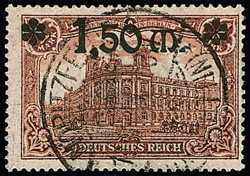 1,50 a. 1 Mk. mit Aufdruckfehler "1 mit breitem Kopf" zentr. gest. "Moritzfelde", sign. Infla, Zenker und Fotoexp. Oechsner. Mi. 380,-