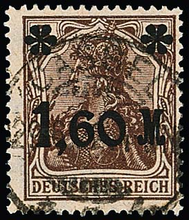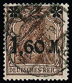 1,60 Mk. a. 5 Pfg., Aufdruck-Abart "Zwischenraum über 10mm" sauber gestempelt, ganz min. Eckbug, Fotoexp. Fleiner. Mi. 400,-
