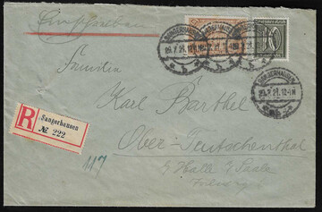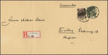 10 Pfg. schwarzoliv (leichter Eckbug) nebst 1,50 Mk. rötlichbraun auf Bedarfs-R-Brief (Gebrauchsspuren) aus Sangerhausen, Fotoexp. Fleiner. Mi. 520,-