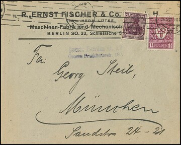 1 1/4 Mk. Gewerbeschau in guter Farbe hellilarosa, nebst 75 Pfg. Germania, auf portoger. Brief aus Berlin, 24.5.22, sign. Tworek. Mi. 600,-