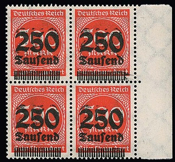 250 T. a. 500 Mk. mit doppeltem Aufdruck (einmal schwächer und nach oben verschoben) im postfrischen Rand-Viererblock, Mi. 400,-