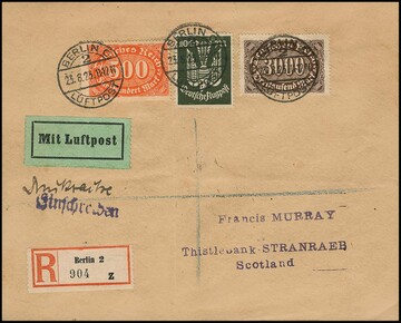 100 Mk. Flugpost Taube, nebst 500 und 3000 Mk. Queroffset auf Lupo-Einschreibe-Auslands-Drucksache von Berlin, 23.8.23, nach Schottland, rs. bei der oberen Briefklappe kleiner Ausschnitt
