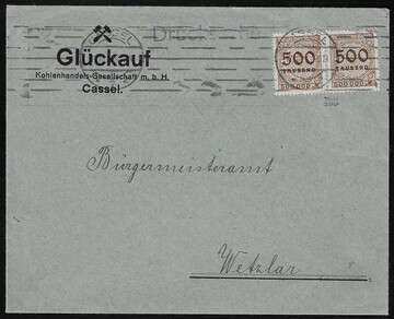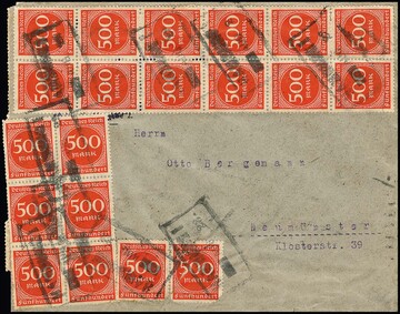 500 Mk., reine Mehrfach-Frankatur von 50 Exemplaren in Einheiten (wenige gebrauchsbedingte kleine Mängel) auf Brief der 2. Gewichtsstufe aus Hamburg (Tages- bzw. Päckchenstempel), sign. Infla, Winkler