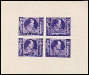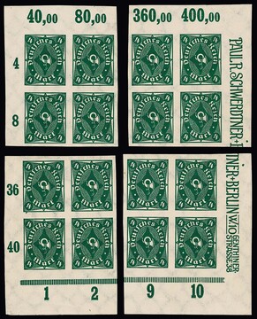 4 Mk., Abart "ungezähnt", alle vier Bogenecken jeweils in tadellos postfrischen Viererblöcken, je Fotoexp. Tworek. Mi. lose 1600,- +