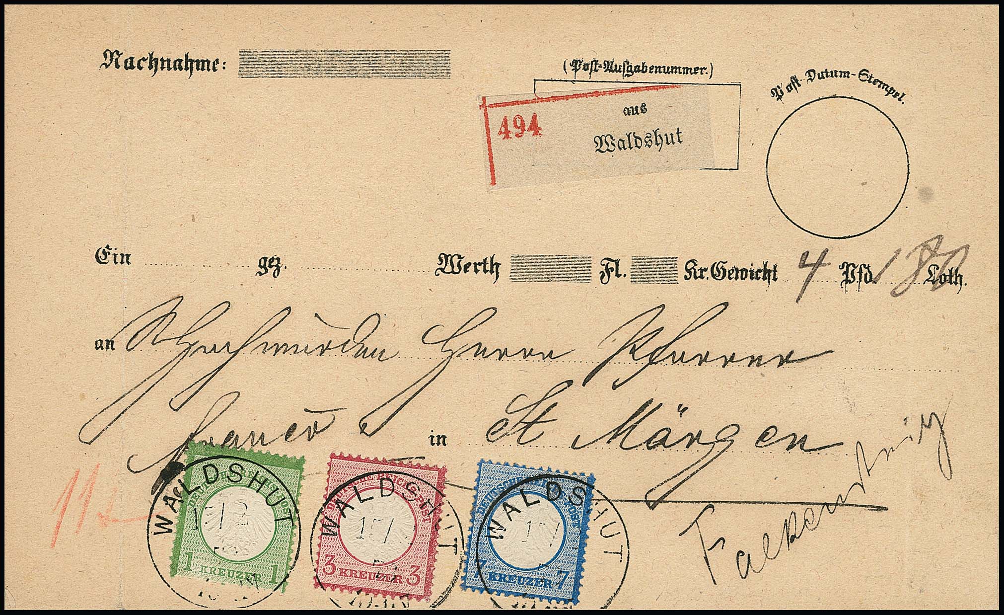1 Kr. grün und 7 Kr. blau in Mischfrankatur mit großes Schild 3 Kr. rosa auf dekorativem, vollständigem Paketbegleitbriefbogen von Waldshut nach St. Märgen, 7 Kr. blau min. Bugspur bzw. kleine Zahnkorrekturen, sign. Sommer