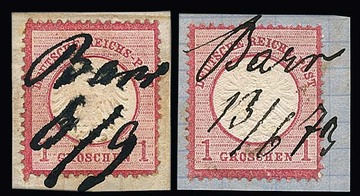 1 Gr. rosa, kleines (kurzer Zahn) und großes Schild, zwei Briefstücke je mit handschriftlicher Entwertung "Barr" (Elsaß)