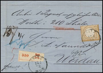 5 Gr. ockerbraun (eine etwas getönt), drei Einzelfrankaturen auf Paketbegleitbriefen (eine Vorderseite, einmal kl. Papiermgl.), Mi. 1350,-