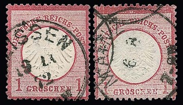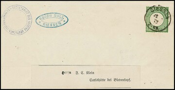1 Kr. grün, kl. Schild (min. Tönung), auf sauberem Ortsbrief, sowie 1 Kr., gr. Schild, auf Ortskarte, je Einzelfrankaturen aus Darmstadt, Mi. 370,-