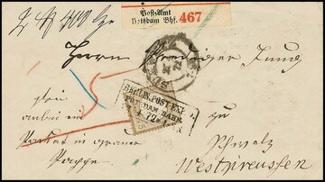 1 Gr. rosa, sieben Exemplare (teils kleine Mängel), alle währungsfremd im Kreuzergebiet gebraucht mit Stempeln von Mainz, Frankfurt, Giessen und Darmstadt, eine Fotoexp. Sommer