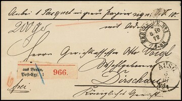 5 Gr. ockerbraun in Mischfrankatur mit 1 Gr. karmin, Kabinettstücke rs. auf Paketbegleitbrief mit K2 "Berlin P.E. No. 1", sign. Krug
