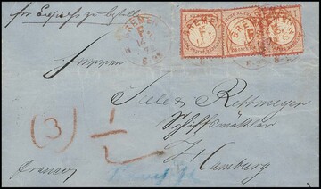 1 Gr. rosa per drei auf Expreß-Faltbrief, mit rotem K1 "Bremen F.N.2" als Markenentwertung, nach Hamburg. Die fehlenden 1/2 Gr. bar bezahlt, rechte Marke "eckrund" und Brief etwas knittrig, jedoch in vorliegender Form mit der irregulären roten Franko-Stempel-Entwertung von größter Seltenheit, Atteste Brugger, Hennies, Rummel, Foto siehe Katalog-Rückseite