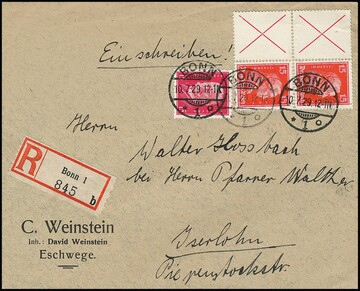 15 Pfg. Kant, der Zusammendruck zweimal im Paar zusammenhängend, nebst 15 Pfg. Hindenburg, auf portoger. R-Brief. Mi. 850,-