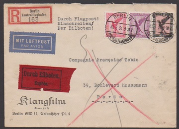 10 u. 15 Pfg., sowie 1 Mk. Flugpost auf portoger. Auslands-Lupo-R-Expreßbrief von Berlin 1931 nach Paris