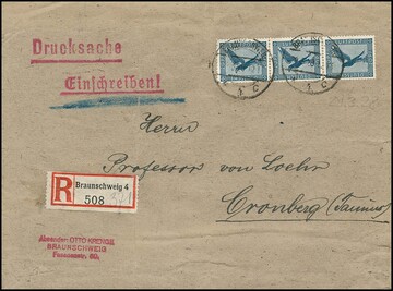 20 Pfg. Flugpost im Dreierstreifen als portoger. MeF auf R-Drucksache der 5. Gewichtsstufe (ab 250gr., typische Gebrauchsspuren) ab Braunschweig, seltene Portostufe