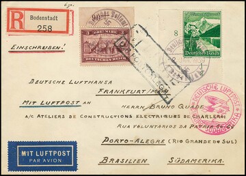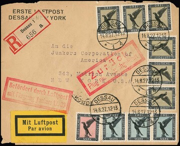 Flugpost 1 RM, dreimal 2 RM sowie sechsmal 3 RM als seltene, sehr hohe 25-RM-Frankatur auf eingeschriebenem Übersee-Erstflugbrief 1927, "Dessau-New York", von Dessau an die Junkers-Werke in den USA, das hohe Porto entsprach der mit der Reichspost vereinbarten Rate von 25 RM für Einschreibebriefe, die mit der JU W33, "Bremen" und "Europa", befördert werden konnten. Der vorliegende Brief wurde mit der "Bremen" befördert (rs. Unterschrift des einzigen Passagiers, v. Hünefeld), dieses Flugzeug geriet in Turbulenzen und musste umkehren (auch das andere Flugzeug scheiterte). Am 4. Oktober wurde der Brief ein zweites Mal, diesmal ab Kiel, gestartet, auch dieser Flug endete vorzeitig (auf den Azoren). Ungewöhnliches Poststück mit kleinen Randmängeln, Artikel aus DBZ 8/2003 über die Flugpost anbei, mit gleich sechsmal der 3 RM Flugpost sehr selten!