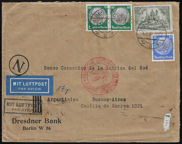 5 Mk. Bauwerke zusammen mit Paar 50 Pfg. Hindenburg und 25 Pfg., beide mit Firmenlochung der Dresdner Bank, auf Lupo-Brief 1935 von Berlin nach Argentinien (Couvert leichte Gebrauchsspuren und zweiseitig geöffnet)