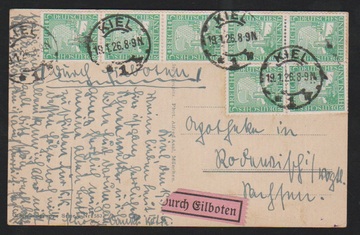 5 Pfg. Rheinland per sieben als gute MeF auf Expreß-Postkarte aus Kiel
