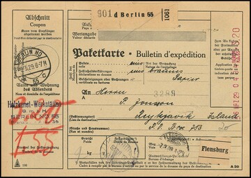 1929, vollständige Paketkarte von Berlin mit seltenem Barfrankierungs-L1 des Postamtes "Berlin No. 55", Porto 3,20 RM, nach Island (!)