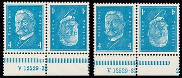 4 Pfg. Hindenburg, zwei postfrische Kehrdrucke je mit HAN "12529.32" in "1" bzw. "2". Mi. 600,-