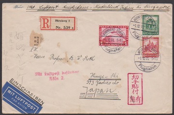 1 Mk. Zeppelin und Zusammendruck 8/15 Pfg. Nothilfe (S88) vs., nebst rs. 3 Pfg., auf Bedarfs-Lupo-R-Brief vom Flughafen Nürnberg-Fürh 1931 nach Japan via Singapur, typische Gebrauchsspuren