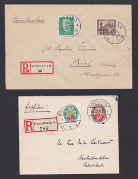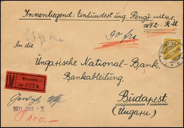 Reichspräsidenten-Ergänzungswerte, drei bessere Einzelfrankaturen: 10 Pfg. auf Einlieferungsschein, ferner 80 Pfg. auf Auslands-Paketkarte in die Schweiz, sowie auf dreiseitig geöffnetem Auslands-Wertbrief von Mittweida 1931 zum Sonderporto nach Budapest/Ungarn