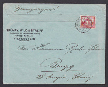 15 Pfg. Nothilfe (links etwas unruhig gezähnt) als seltene Grenzrayon-Einzelfrankatur auf Brief von Albbruck, 27.7.1930, nach Brugg/Schweiz