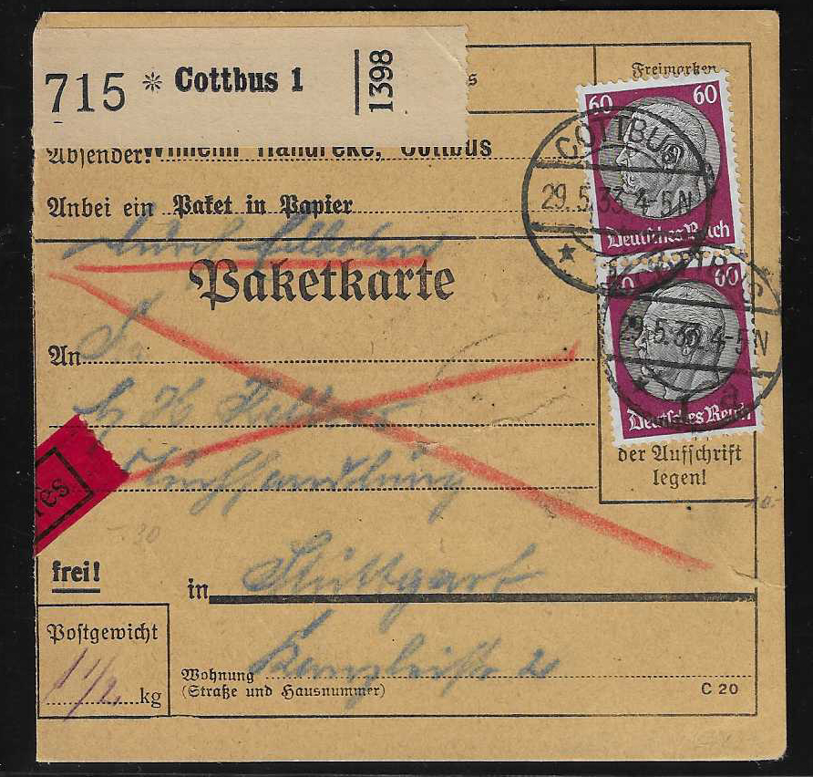 60 Pfg. im Paar als gute MeF auf Expreß-Paketkarte (unbed. Papierfehler) aus Cottbus 1933, Mi. 500,-