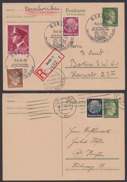 Zwei gute Doppel-Ganzsachenkarten 5 Pfg. Hitler je mit ZuF gelaufen, einmal 1 Pfg. Hindenburg (Frage- und Antwortteil gelaufen), sowie Orts-R-Karte mit portoger. ZuF