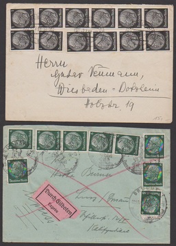 Hindenburg, vier portoger. Briefe mit hohen Mehrfach-Frankaturen 1 Pfg. per acht und per zwölf, 6 Pfg. per neun (Expreß), sowie 8 Pfg. per zwölf (Wert, zwei Marken Mgl.)