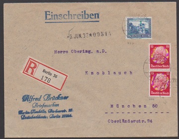25 Pfg. Nothilfe und zweimal 15 Pfg. Hindenburg auf portoger. R-Doppelbrief ab Berlin