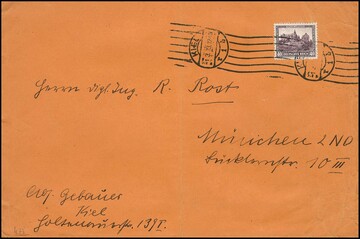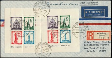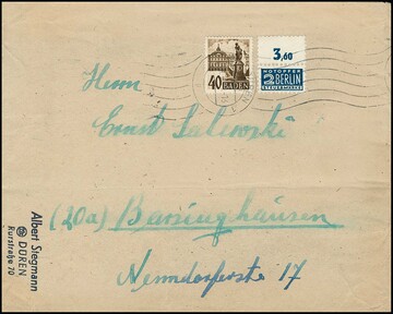 15 Pfg. Nothilfe im seltenen Zwischensteg-Zusammendruck, nebst unten anhängendem Teil von WZ7 (dieser kl. Fleck), auf etwas unsauber geöffnetem R-Brief aus Berlin-Wilmersdorf, Mi. 1200,- +