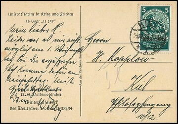 5 Pfg. Nothilfe als Einzelfrankatur auf Bedarfs-Ortspostkarte ("Unsere Marine in Krieg und Frieden, U-Boot U139") aus Kiel 1933, Mi. 1700,-