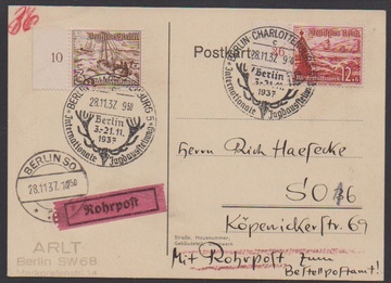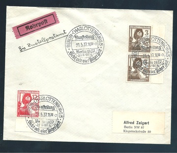 3 Pfg. Luftschutz im Paar, nebst 12 Pfg., auf Rohrpost-Ortsbrief aus Berlin 1937