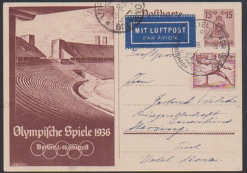 15 + 10 Pfg. Olympa auf Ganzsachenkarte 15 + 10 Pfg. Olympia, als Lupokarte von Kiel nach Tirol