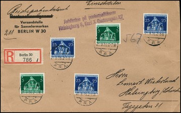 Gemeindekongreß, alle Werte je als Einzelfrankaturen (5 Pfg. drei versch.), sowie Mehrfach-Frankaturen: 3 Pfg. per vier (2), 5 Pfg. per drei (2) und fünf auf portoger. Auslandsbrief (ein Wert Abrieb), 12 Pfg. per zwei, sowie sieben Mischfrankaturen, u.a. portoger. Auslands-R-Brief mit 5(2) u. 25 Pfg. (3)