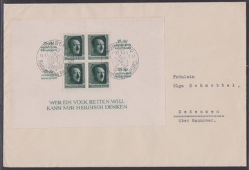 Reichsparteitags-Block vs. und rs. per zwei als Mehrfach-Frankatur auf fast portoger. R-Brief (typische Gebrauchsspuren) aus Nürnberg, nur 6 Pfg. zuviel, aber so sehr ungewöhnlich! Ferner der Block einzeln auf Brief ab Nürnberg