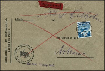40 Pfg. Lufthansa, zwei verschiedene Einzelfrankaturen: auf Auslands-Doppelbrief in die Schweiz, sowie auf an sich portofreiem Expreßbrief "Frei durch Ablösung Reich", nur die Expreßgebühr mit Marke frankiert (mit Sondermarke seltene Variante, zwei kurze Zähnchen)