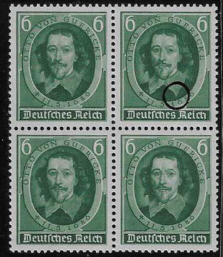 6 Pfg. Guericke im postfrischen Viererblock, linke untere Marke (min. Gummiunregelmäßigkeit) mit Plattenfehler "zweite Locke", Fotoexp. D. Schlegel. Mi. 600,-