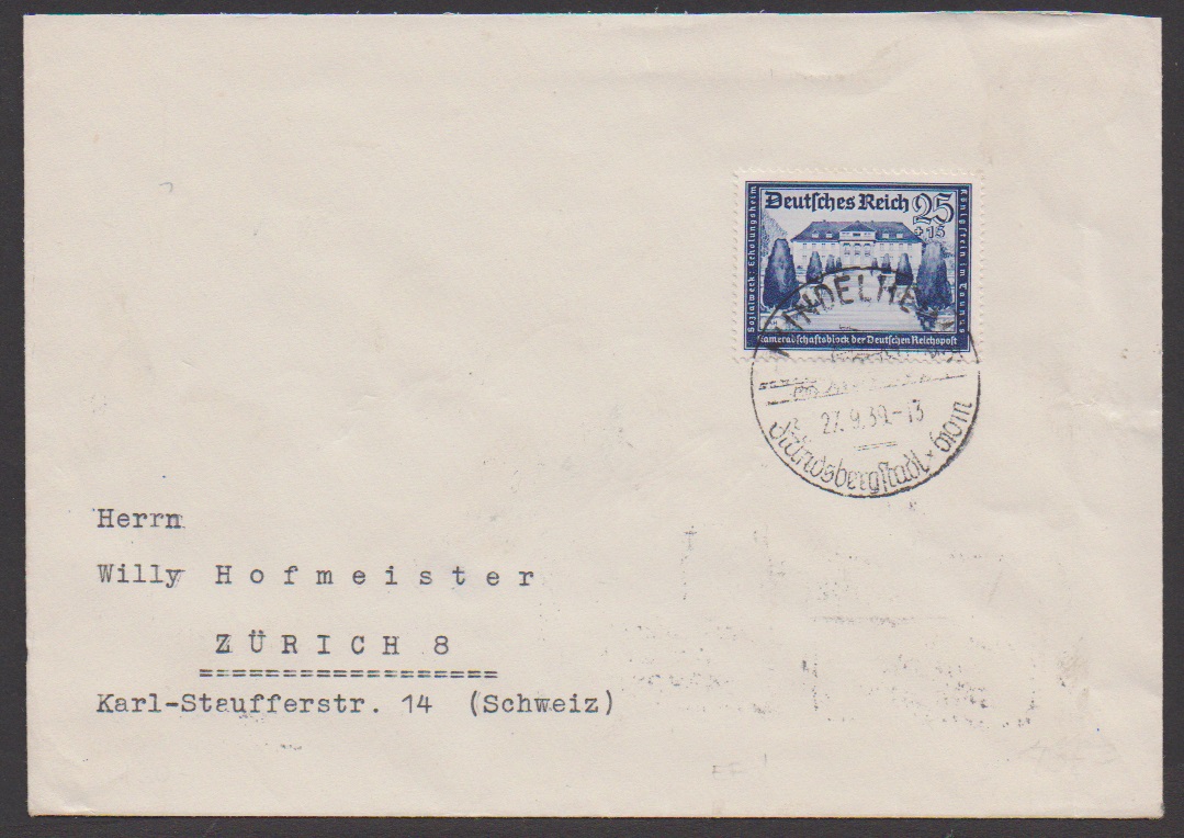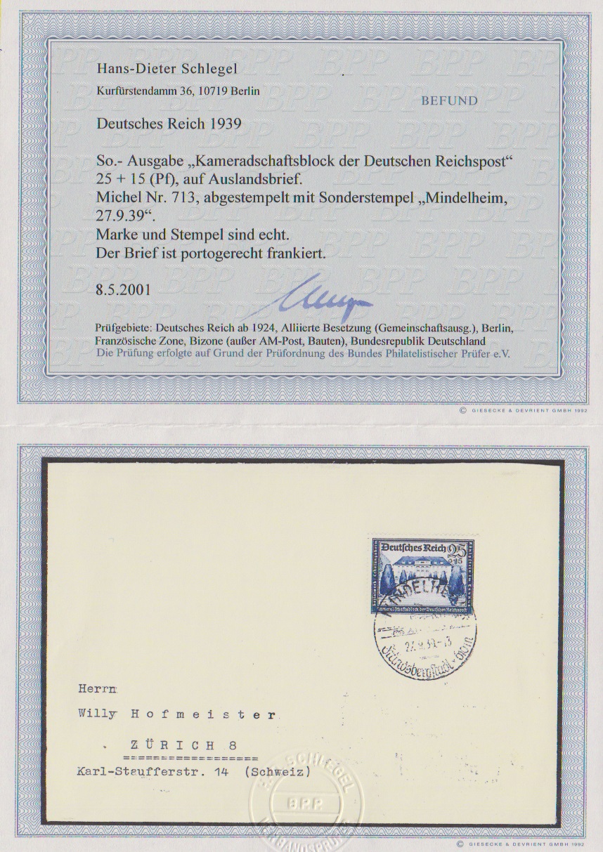 25 + 15 Pfg. Kameradschaftsblock als portogerechte Einzelfrankatur auf Auslandsbrief von Mindelheim 1939 in die Schweiz, Fotoexp. Schlegel