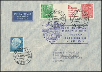 25 + 15 Pfg. WHW, vier portogerechte Einzelfrankaturen auf Auslandsbriefen, nach Finnland (mit Weitersendung), Italien (weiter in die Schweiz), Rumänien und in die USA, ferner EF 40 + 35 Pfg. WHW auf Auslands-Doppelbrief. Mi. 520,- +
