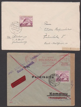 40 + 35 Pfg. WHW, zwei versch. Einzelfrankaturen: auf Zensur-Auslands-Doppelbrief in die Schweiz, sowie als Expreßgebühr auf Zensur-Brief ins Sudetenland, das normale Porto mit AFS bezahlt